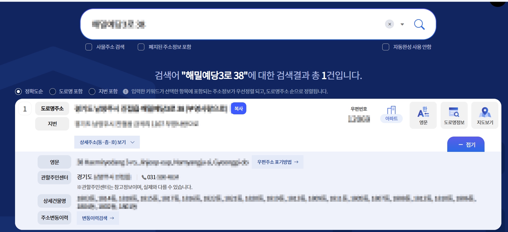 • 해당 주소의 관할 주민센터 찾기 완료!